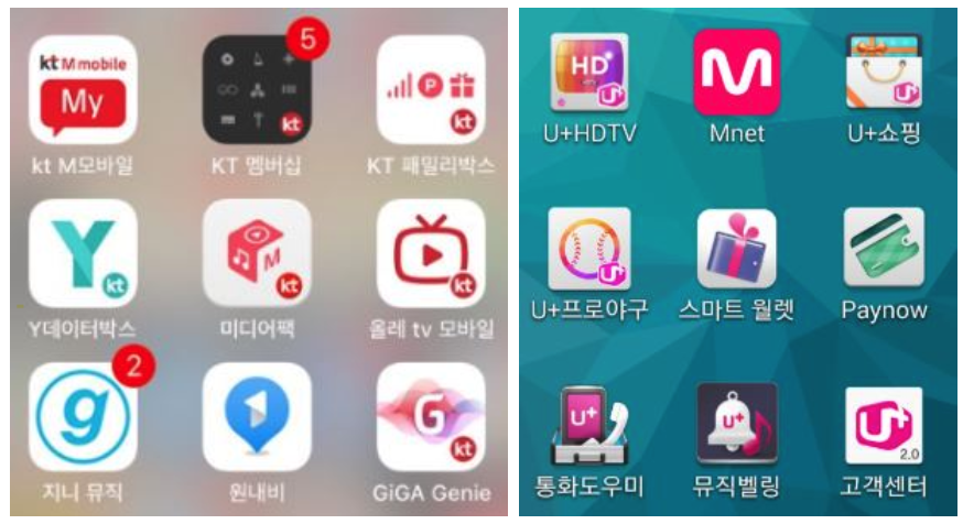 통신사마크 : 스마트폰 케이스에 LG, SK, KT마크가 있거나 핸드폰 실행 시 보이는 문구 등