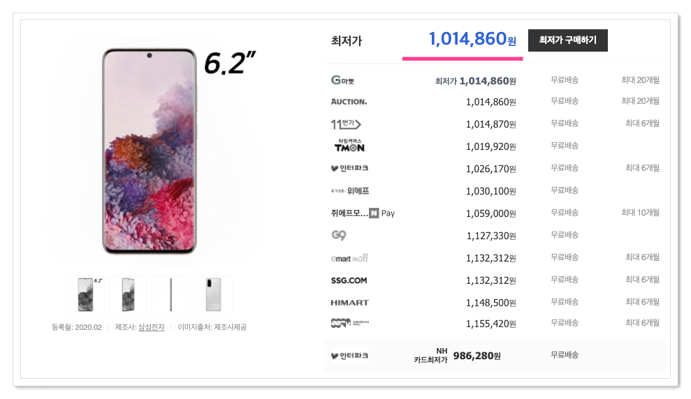 갤럭시 S20으로 살펴보면 아래와 같이 가격이 형성 된다.