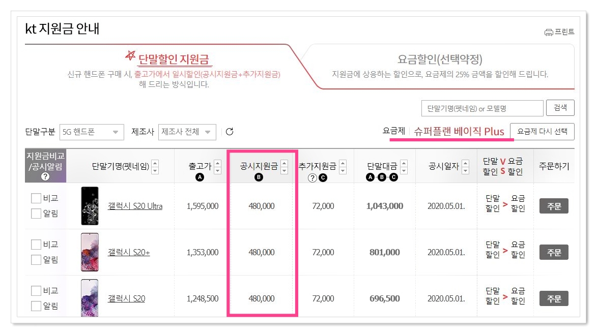 갤럭시 S20을 보면 슈퍼플랜 베이직 Plus 요금제(8만원)를 쓰면 출고가에서 48만원을 할인받아 구매할 수 있다.