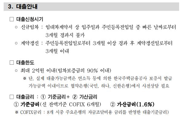 단, 거주주택의 연장계약인 경우 주민등록전입일로부터 3개월 이상 경과하고, 갱신계약일(재계약시작일)로부터 3개월 이내 은행에 대출신청을 해야 한다.