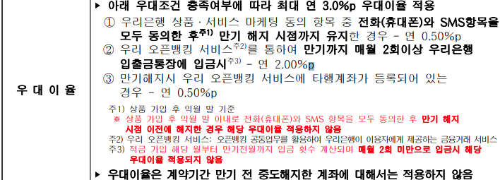 우대조건을 지키지 않은 시중금리보다 낮은 경우가 많아 꼭 지켜야하고 지키지않는다면 시중금리보다나 낮아지는 경우도 있어 가입한 의미가 없어진다.
