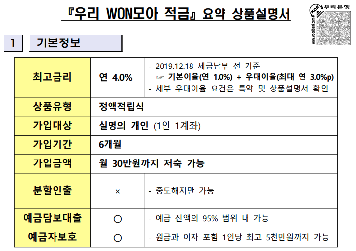 | 우리 원 모아 | 4.0% / 30만원 / 6개월 세전 이자 = 21,000원 |