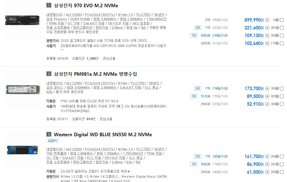 16GB 램이 7만원대로 약 171% 가격이 높고 SSD 또한 9만원대로 77% 가격이 비싸다.