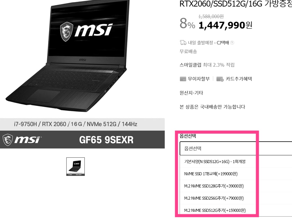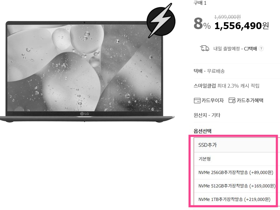 위의 사진들 처럼 "메모리(RAM)"과 "SSD"의 옵션을 추가로 선택 할 수 있다.