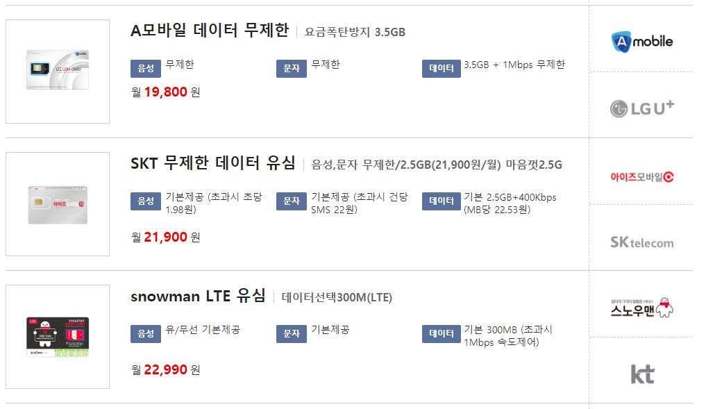 | 장점 | - 저렴한 요금 * 기존 통신사대비 50%이상 저렴한 경우가 대다수 - SKT/KT/LG U+ 의 망을 사용하기때문에 성능상 큰 차이가 없음 |