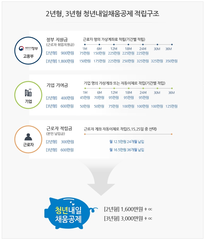 | 가입대상 | - 청년 내일 채움 공제 가입기간 2년, 3년 중소(중견)기업에 정규직으로 취업한 청년 취업 후 3개월 이내에 가입 (2020년 이후 참여자 부터 6개월 이내에 가입) - 청년 재직자 내일 채움 공제 가입기간 5년 중소/중견기업에 정규직으로 6개월 이상 재직하고 있는 청년 근로자 ( 만 15~34세 이하) - 내일 채움 공제 가입기간 5년 중소/중견기업 재직자로 연령제한이 없음 |
