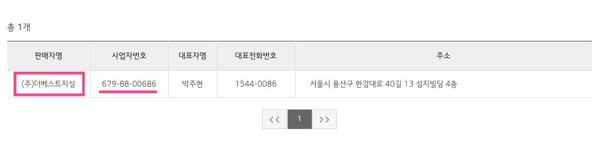 실제로 조회를 한 화면으로 위의 화면처럼 '사업자번호'와 기타 정보가 표시되어 있어 오픈마켓에 등록된 '판매자정보'와 비교를 하면 된다.