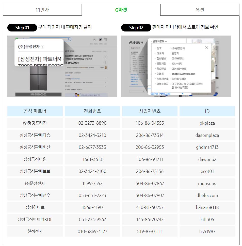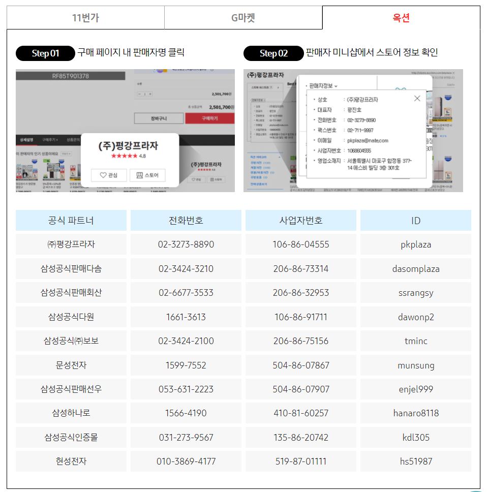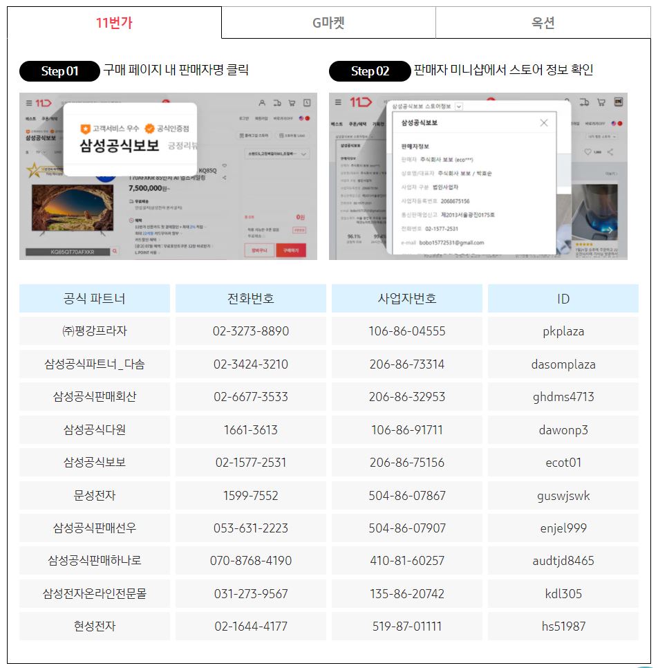 아직은 11번가/지마켓/옥션의 삼성전자공식파트너가 조회가 가능하다.